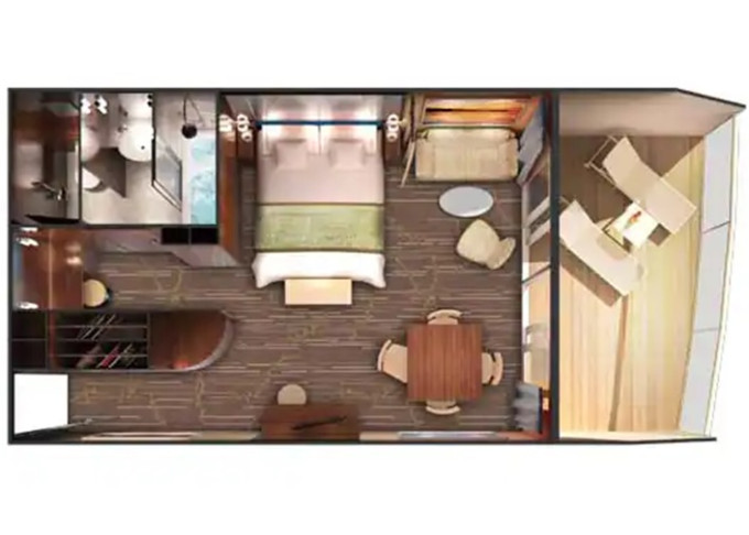 | SN - Aft-facing Penthouse Suite 32-34 m² / balkón 5-7 m². 8,9. paluba - vzadu. Max 3 osoby. Výhody Suite. | 4 988 € 2 494 € za osobu | ||