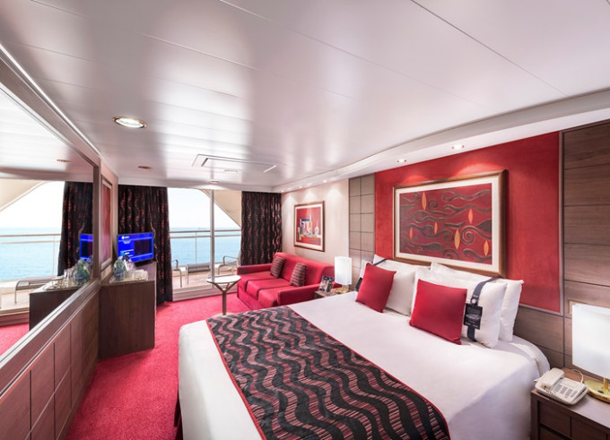 Suite s balkónom: cca31m², kajuta s manželskou posteľou (na požiadanie 2 oddelené postele) a rozkladacia pohovka. Klimatizácia, kúpeľňa s vaňou, toaletný stolík, priestorná skriňa, interaktívna TV, telefón, minibar, sejf, sušič na vlasy. Balkón so stolíkom a stoličkami. Internetové pripojenie (za poplatok).