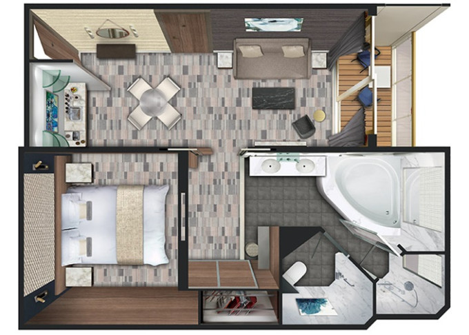 | SE - Forward-facing Penthouse 51 m² / balkón 10 m². Vírivka.10. paluba - vpredu. Max 3 osoby. Výhody Suite. | 19 432 € 9 716 € za osobu | ||