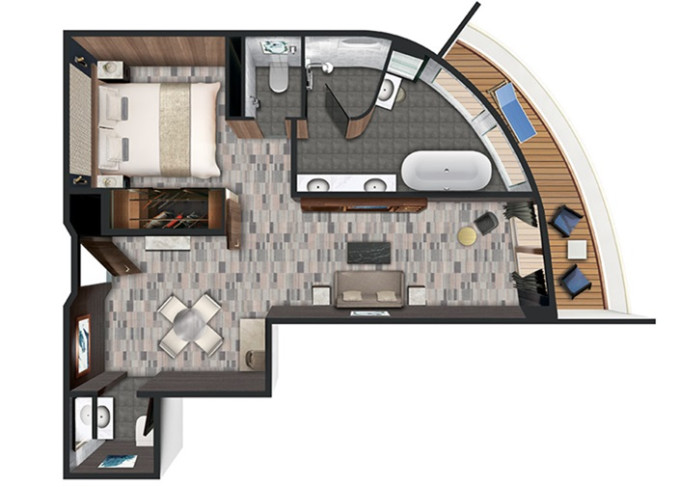 | SB - Aft-facing Owners Suite 56 m² / balkón 6 m². Vírivka. 9. paluba - vzadu. Max 2 osoby. Výhody Suite. | 27 042 € 13 521 € za osobu | ||